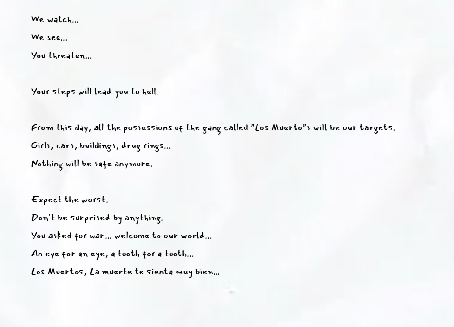In the early hours, the Gutter Gazette received a chilling anonymous message via encrypted email. The sender, whose identity remains unknown, issued a bold and ominous threat directed at the infamous Los Muertos gang — a criminal organization long suspected of operating across the city’s southern districts.